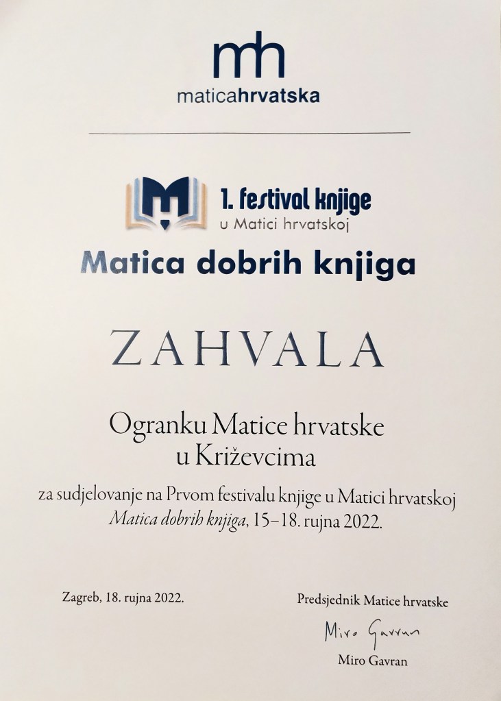 U povodu 180. obljetnice osnutka Matice hrvatske u impresivnom dvorištu Matice hrvatske otvoren je 15. rujna 2022. Prvi festival knjige. Pod sloganom „Matica dobrih knjiga” u četiri dana planira se predstavljanje 40-ak novih izdanja središnjice, ogranaka i drugih izdavača, a lijepu riječ pratit će i druge umjetnosti – koncerti i izložbe. Tijekom prvoga dana festivala svoja najnovija izdanja posjetiteljima je pokazao i križevački ogranak, a na osobit ponos križevačkim „matičarima” bilo je predstavljanje knjige Križevački liječnici u pohodu Egiptu autora Franje Husinca i Frana Gundruma. Knjigu su predstavili prof. dr. sc. Stella Fatović Ferenčić i Franjo Husinec. Na predstavljanju su nazočili predsjednik Matice Miro Gavran, potpredsjednik Damir Zorić te glavni tajnik Marijo Dominiković.