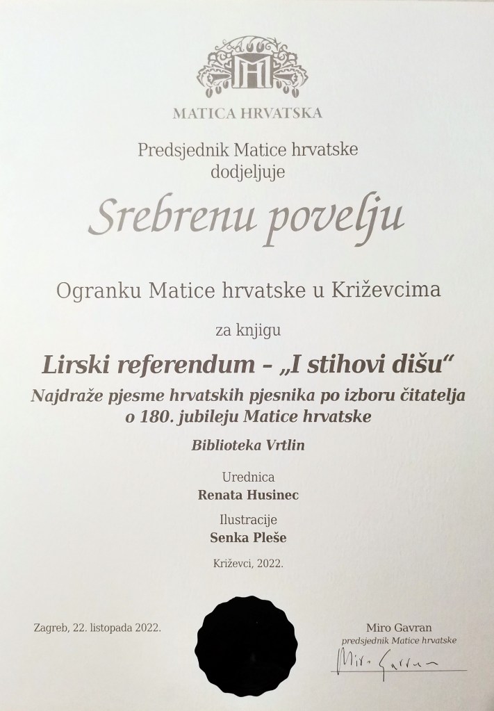 U Dvorani „Vatroslav Lisinski” u Zagrebu okupila se u subotu 22. listopada 2022. velika Matičina obitelj iz svih dijelova Hrvatske, ogranci iz Bosne i Hercegovine te Boke kotorske, kao i uvaženi gosti. Osim radnog dijela skupštine, koju je vodilo predsjedništvo u sastavu Miro Gavran (predsjednik), Damir Zorić (potpredsjednik), Marijo Dominiković (glavni tajnik), Ivica Nuić (gospodarski tajnik), Mario Jareb (potpredsjednik) i Dubravka Oraić Tolić (potpredsjednica), umjetnički su događaj uveličali Klapa Stine i dramska umjetnica, ujedno i predsjednica Časnoga suda MH, Anja Šovagović Despot. I ove su godine dodijeljene povelje najboljim izdanjima ogranaka, a križevački se ogranak ovjenčao još jednom poveljom, ovaj put srebrnom za knjigu Lirski referendum – I stihovi dišu.