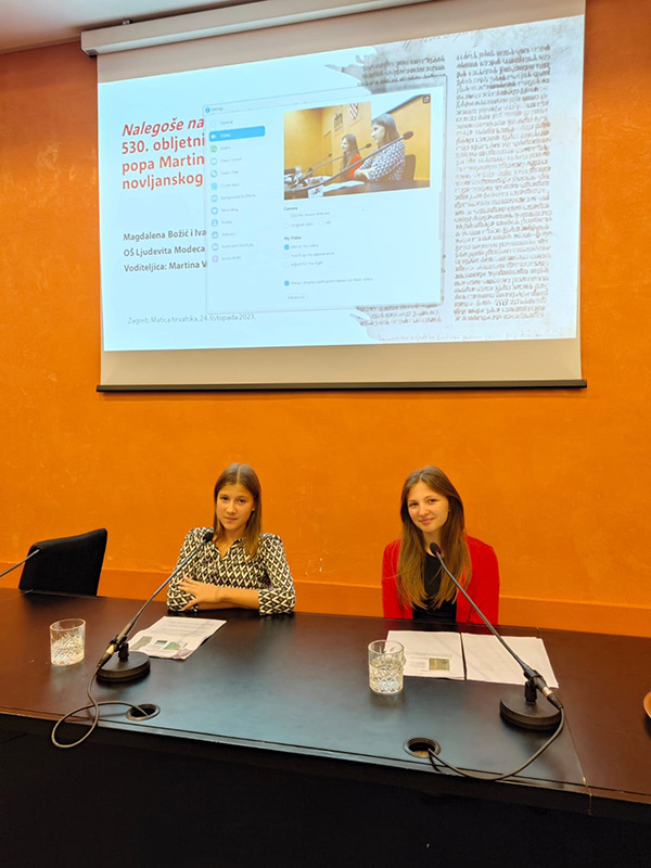 U velikoj dvorani Matice hrvatske u Zagrebu 24. listopada križevačke glagoljašice Iva Koprić i Magdalena Božić zanimljivim su multimedijalnim predavanjem otvorile ciklus „Mladi glagoljaši u Matici hrvatskoj”. Na poziv profesorice Biserke Draganić, pročelnice Odjela za hrvatsko glagoljaštvo Matice hrvatske, a pod mentorstvom svoje profesorice Martine Valec-Rebić, održale su predavanje „Nalegoše na jazik hrvatski – 530. obljetnica Zapisa popa Martinca iz Drugog novljanskog brevijara”.