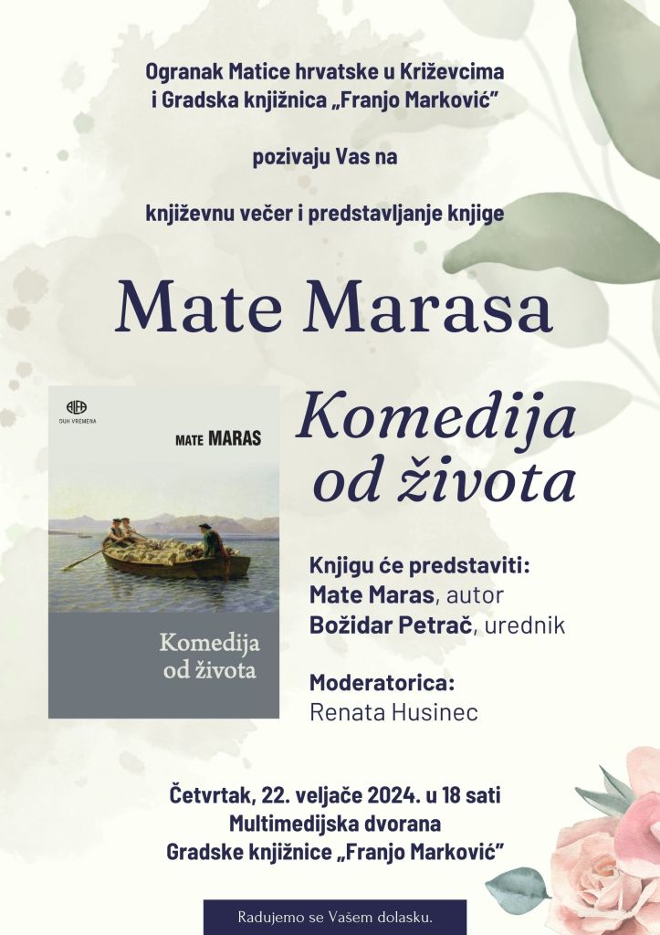 Ogranak Matice hrvatske u Križevcima i Gradska knjižnica „Franjo Marković” organizirali su 22. veljače 2024. književnu večer s prevoditeljem i pjesnikom Matom Marasom. Predstavio je knjigu Komedija od života. Uz autora knjigu je predstavio i urednik Božidar Petrač. Moderatorica je bila Renata Husinec, predsjednica Ogranka Matice hrvatske u Križevcima.