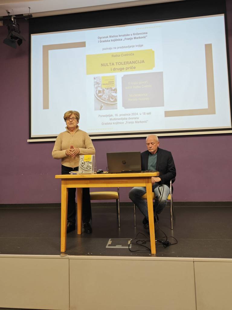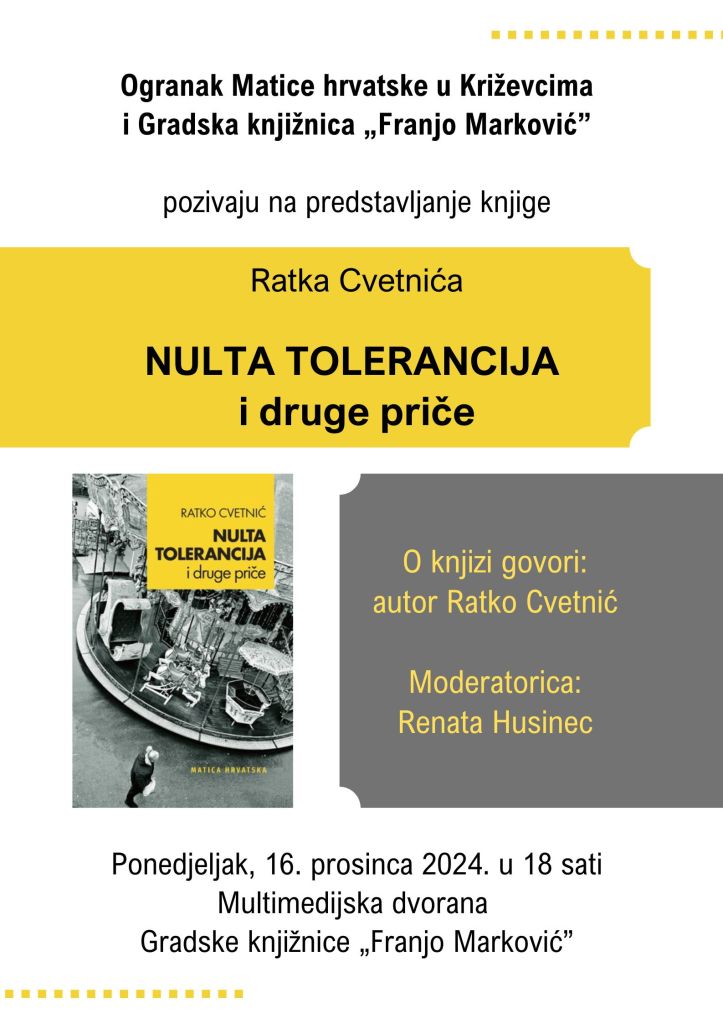 Ogranak Matice hrvatske u Križevcima i Gradska knjižnica „Franjo Marković” organizirali su u ponedjeljak 16. prosinca predstavljanje knjige Ratka Cvetnića „Nulta tolerancija i druge priče”. Knjigu je predstavio sam autor, a moderatorica je bila Renata Husinec.