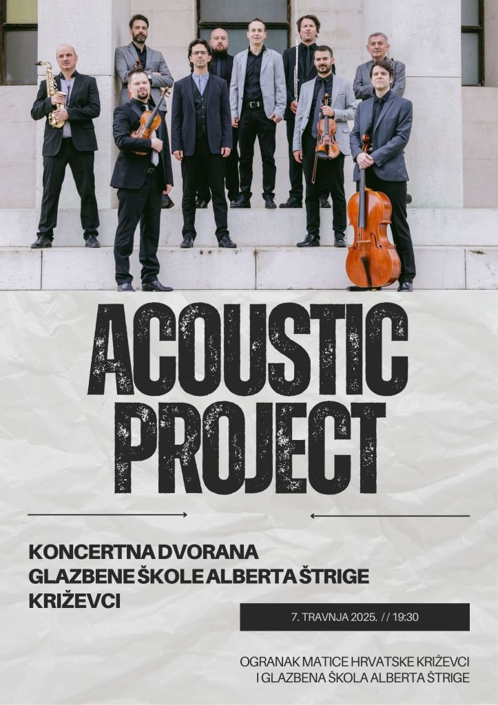 Acoustic Project već je godinama među najistaknutijim hrvatskim ansamblima koji je svojim inovativnim i originalnim zvukom zauzeo posebno mjesto u suvremenoj glazbenoj praksi i značajno doprinio obogaćivanju glazbenih izričaja na području klasične glazbe. Osnovan je 2008. godine, a njegov idejni tvorac i vođa je skladatelj i kontrabasist Dubravko Palanović. Taj jedinstveni ansambl, sastavljen od deset vrhunskih glazbenika, od kojih su mnogi virtuozi na svojim instrumentima imali su priliku prvi put upoznati brojni Križevčani u dupkom punoj koncertnoj dvorani Glazbene škole Alberta Štrige u organizaciji Ogranka Matice hrvatske u Križevcima. Iznimna posjećenost koncerta klasične glazbe bila je potpuno opravdana nastupom ansambla koji je izazvao iskreno oduševljenje među publikom svih generacija. Ono što karakterizira i izdvaja ovaj sastav i nailazi na dobar prijem i odobravanje slušatelja je otvoreni i istraživački pristup prema različitim glazbenim stilovima i žanrovima koji stvara posebnu fuziju klasične glazbe s jazzom, tradicionalnom glazbom i popularnom glazbom kao i posebnost zvuka stvorenog od nekonvencionalnog spoja različitih instrumenata kao što su gudački, puhački i perkusionistički s povremenim izletima u elektroniku. Palanović se predstavio najprije svojim novijim skladbama Između vjetrova, Prvo sunce i Otrovni mjesec, ovaj put bez etna, a s izraženom jazz komponentom. Slijedila je skladba Odlazak u kojoj je dao prednost solistima prije no što je živim interpretima pridodao diskretni elektronski zvuk manje kao kontrast, više kao dodatak. Slijedila je skladba Frana Đurovića, inače cara elektronike koji je ovaj put napisao akustično djelo, samo za Acoustic Project, potraživši za naslov nadahnuće u stihovima pop kulture. Izvukao je iz sjećanja neki svoj davni mladenački sentiš uz evergreen Parnog valjka, Jesen u meni i nazvao je Rano moja hej prema stihu iz iste pjesme.U drugom dijelu koncerta „akustičari” su predstavili svoj stariji repertoar iz Palanovićeva opusa, sada s izravnim naglaskom na tradicijsku glazbu raznih krajeva Hrvatske, od istarske ljestvice preko Dalmacije i Dalmatinske zagore do slavonskih drmeša i Zagreba i njegove okolice uglavnom s hvaljenog albuma Furious Dance (Divlji tanac) iz 2022: Mistični putevi Istre, Sjećam se „Plavog trnaca“, Za pjesmu volje nemam, Divlji tanac, U očima led i sjaj te Kamene zvijezde. Između su se skladno smjestila Četiri lita i četiri zime dubrovačkog gitarista-skladatelja Srđana Berdovića. Ovaj koncert bio je putovanje u još neistraženo područje puno uzbuđenja i novih glazbenih krajolika vrijednih otkrivanja, glazbe koja pokreće, nadahnjuje i koja sasvim sigurno nikoga neće ostaviti ravnodušnim.