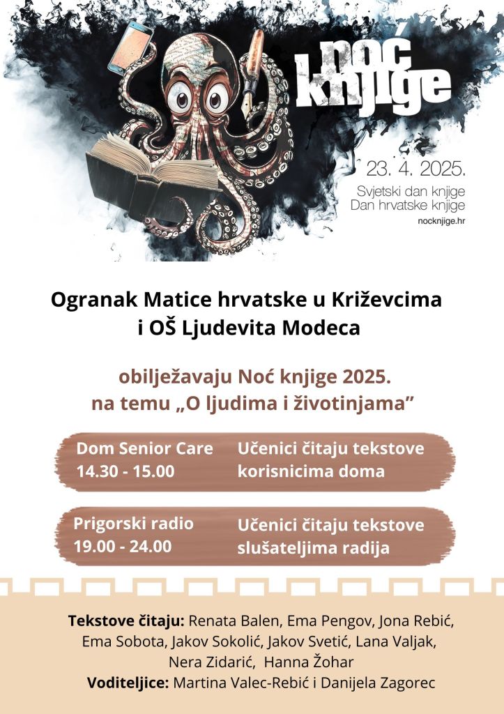 “O životinjama i ljudima” tema je ovogodišnje Noći knjige povodom koje je Ogranak MH u Križevcima osmislio i proveo aktivnosti u suradnji s OŠ Ljudevita Modeca. Učenici su čitali tekstove svjetskih i hrvatskih pisaca koji su se puštali na Prigorskom radiju u Noći knjige. Ranije istoga dana učenici su posjetili Dom Senior Care gdje su tijekom polusatnoga druženja razveselili korisnike doma ulomcima iz djela Zvonimira Baloga, Vladimira Nazora, Stjepana Jakševca, Božidara Prosenjaka, Luke Paljetka, Scotta O’Della, Isaaca Bashevisa Singera, Richarda Bacha i drugih.
