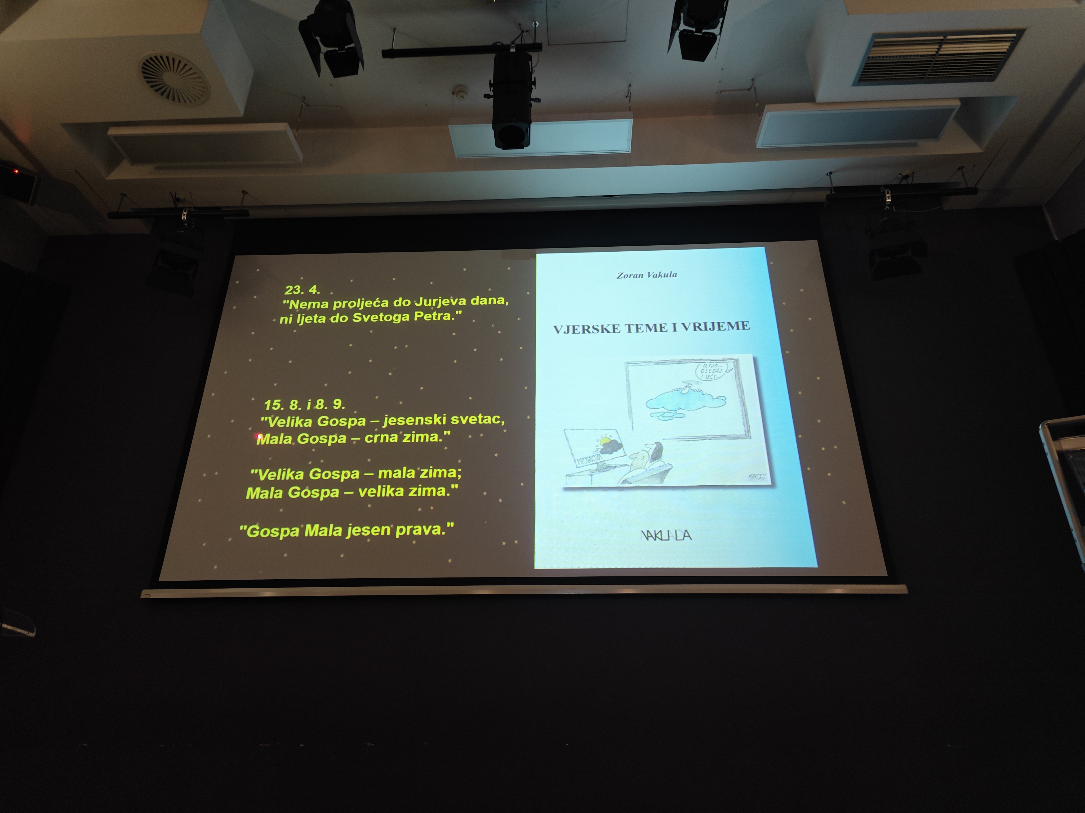 Vakula je održao izuzetno zanimljivo i pristupačno predavanje o vremenu, meteorologiji i klimatskim promjenama. Uz brojne grafove, meteorološke karte i ilustracije objasnio je kako nastaju prognoze, kako se tumače meteorološki modeli te na koji način klimatske promjene utječu na svakodnevni život. U izlaganju je spomenuo i povijest meteorologije u Hrvatskoj podsjetivši na pionire koji su bilježili vremenske pojave mnogo prije suvremenih tehnologija – Tomislava Vučetića, Mihovila Kisegija, Vesnu Jurčec i Milana Sijerkovića.