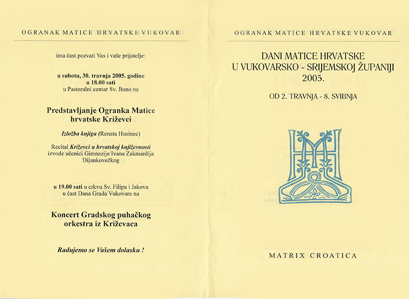 Križevački Ogranak MH sudjelovao je na Danima Matice hrvatske u Vukovarsko-srijemskoj županiji, koji su trajali od 2. travnja do 8. svibnja 2005. u Vukovaru, Vinkovcima, Iloku, Županji, Babinoj Gredi, Lovasu, Nuštru, Starim Mikanovcima, Bošnjacima, Gunji, Otoku, Drenovcima, Cerni, Šarengradu, Bogdanovcima, Privlaci i Vrbanji.