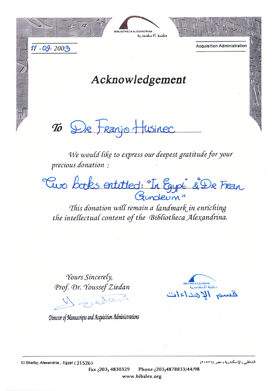 - PRIZNANJE biblioteke Alexandrine za dar dviju knjiga Matice hrvatske Križevci (Fran Gundrum Oriovčanin i In Egypt), Aleksandrija (11. 9. 2003.)