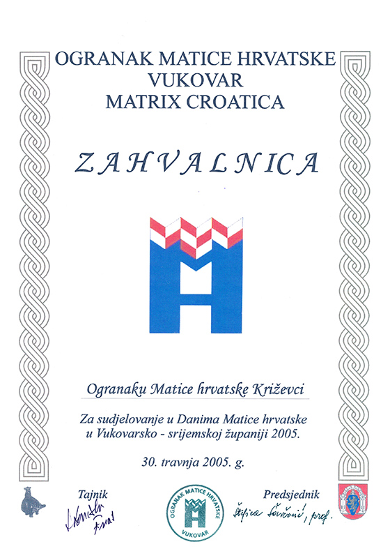 - ZAHVALNICA Ogranka Matice hrvatske Vukovar za sudjelovanje u Danima Matice hrvatske u Vukovarsko-srijemskoj županiji (30. 4. 2005.)