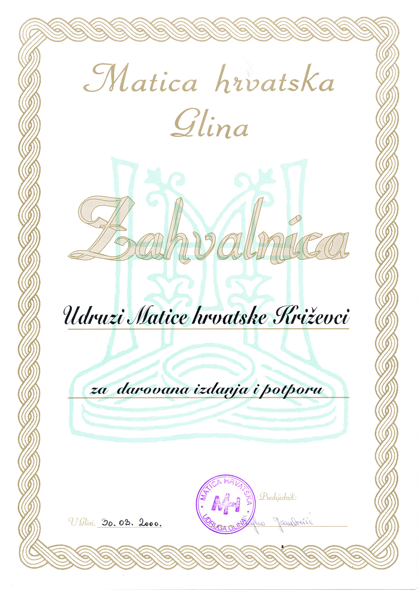 - ZAHVALNICA Matice hrvatske Glina za darovana izdanja i potporu (30. 3. 2000.)