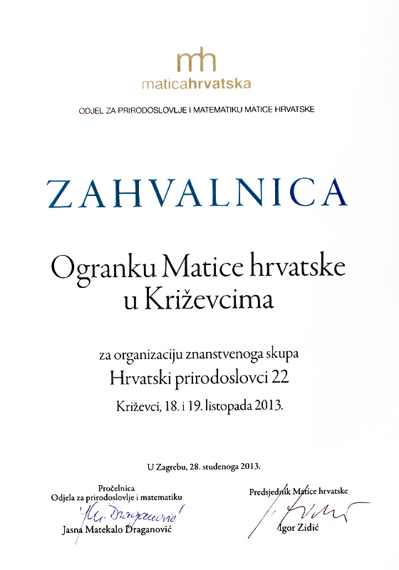 - ZAHVALNICA Matice hrvatske za organizaciju znanstvenog skupa Hrvatski prirodoslovci (2013.)