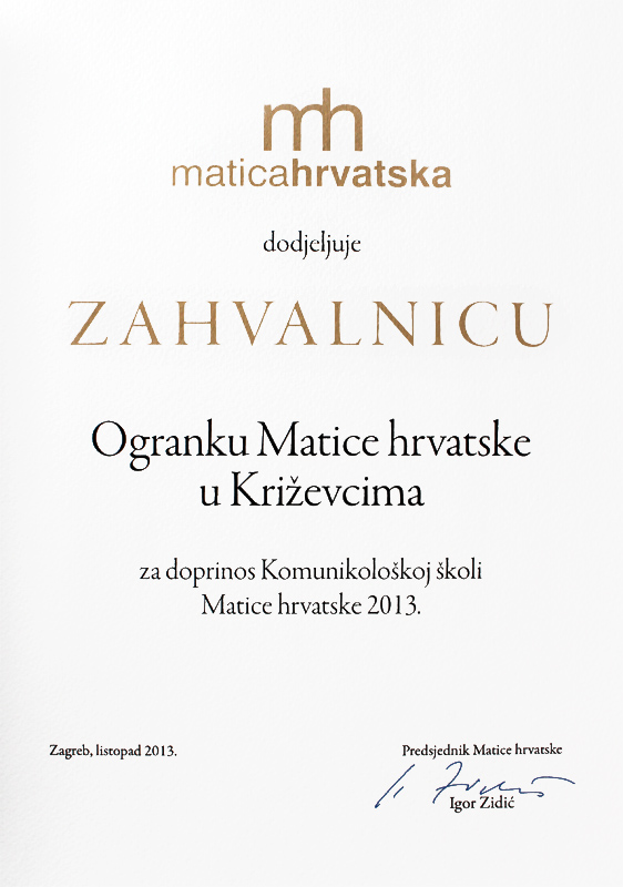 - ZAHVALNICA Matice hrvatske za doprinos Komunikološkoj školi Matice hrvatske (2013.)