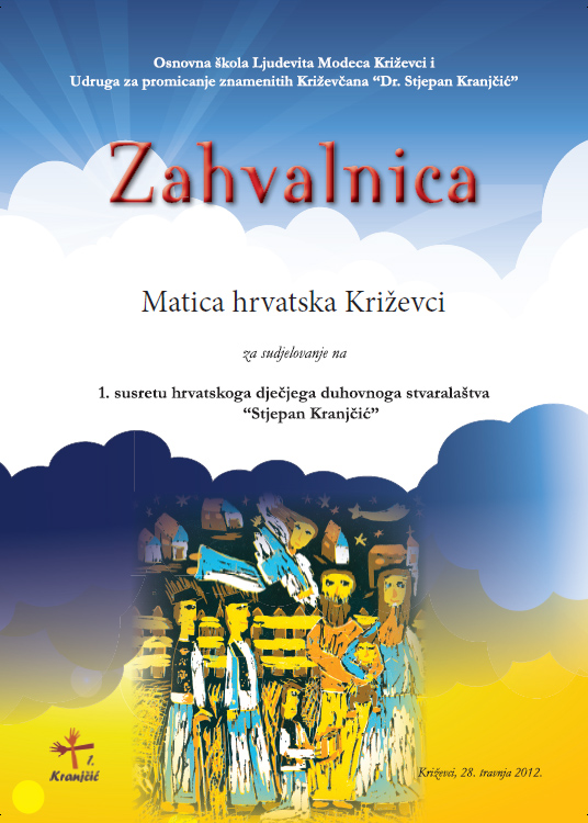 - ZAHVALNICA OŠ Ljudevita Modeca i Udruge za promicanje znamenitih Križevčana „Dr. Stjepan Kranjčić” za pokroviteljstvo nagrade na 1. Susretu hrvatskoga dječjega duhovnoga stvaralaštva „Stjepan Kranjčić” (2012.)